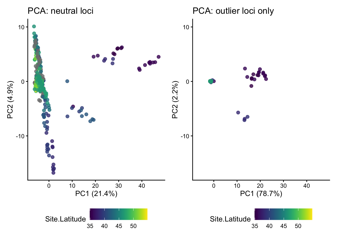 - Add commented text or a Markdown chunk below the PCA plot comparison with your interpretation of the differences between results from neutral loci and outlier loci.