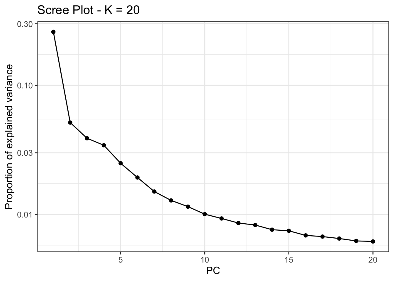 After loading a .csv with the study’s metadata, we can read in our .vcf using pcadapt directly, saving it to an object with a name of our choosing (here, x). The next line of code is the program’s core function, performing principal component analysis and then looking for outliers relative to the first K principal components (note that this is not necessarily analogous to the number of populations in your data). To select the optimal number of PC axes, we can produce a screen plot to explore the change in the proportion of variance retained with each additional axis, looking for the point where the change in variance begins to flatten: