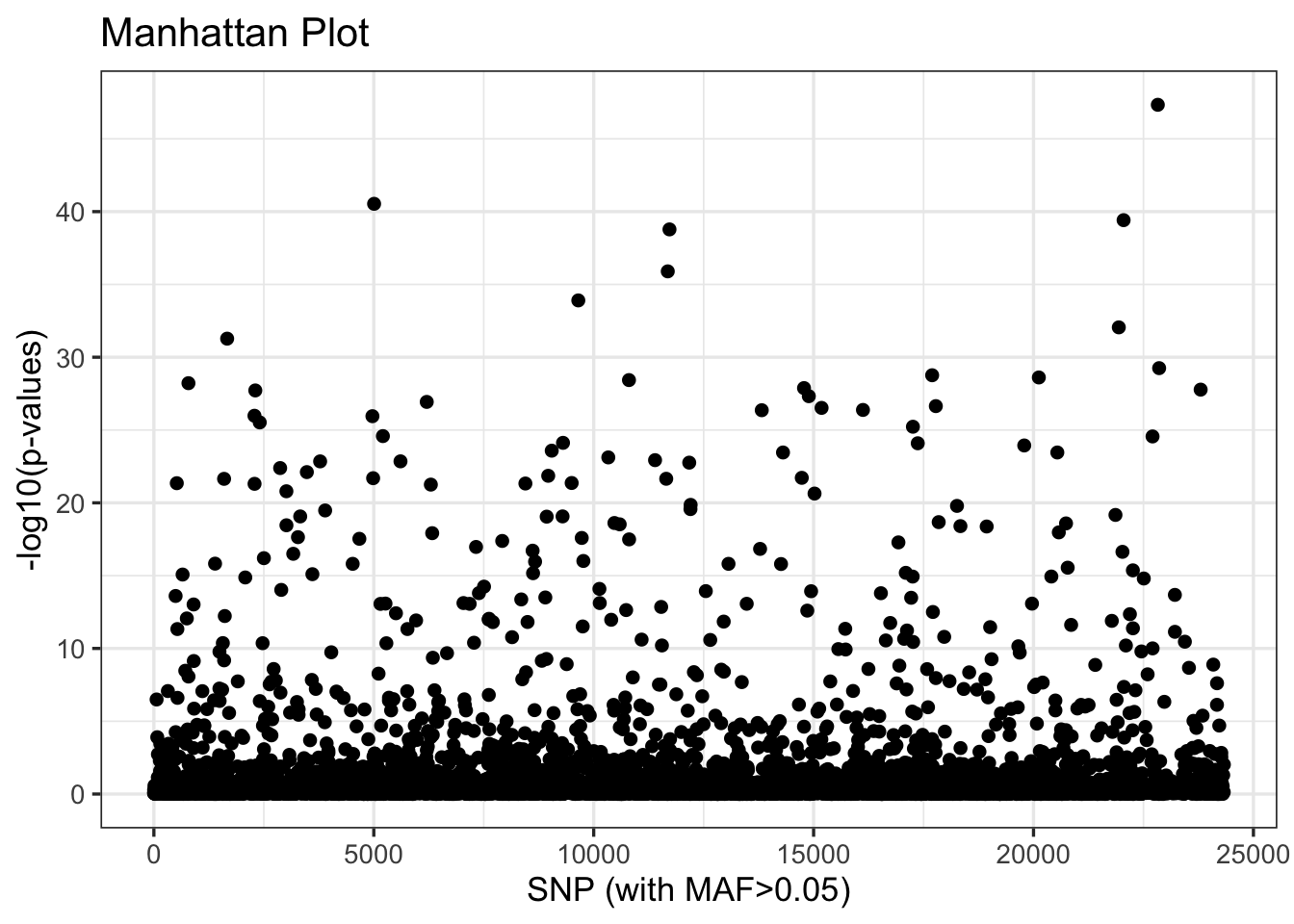 We can look at the distribution of these outliers relative to their order in the .vcf with the plot() function: