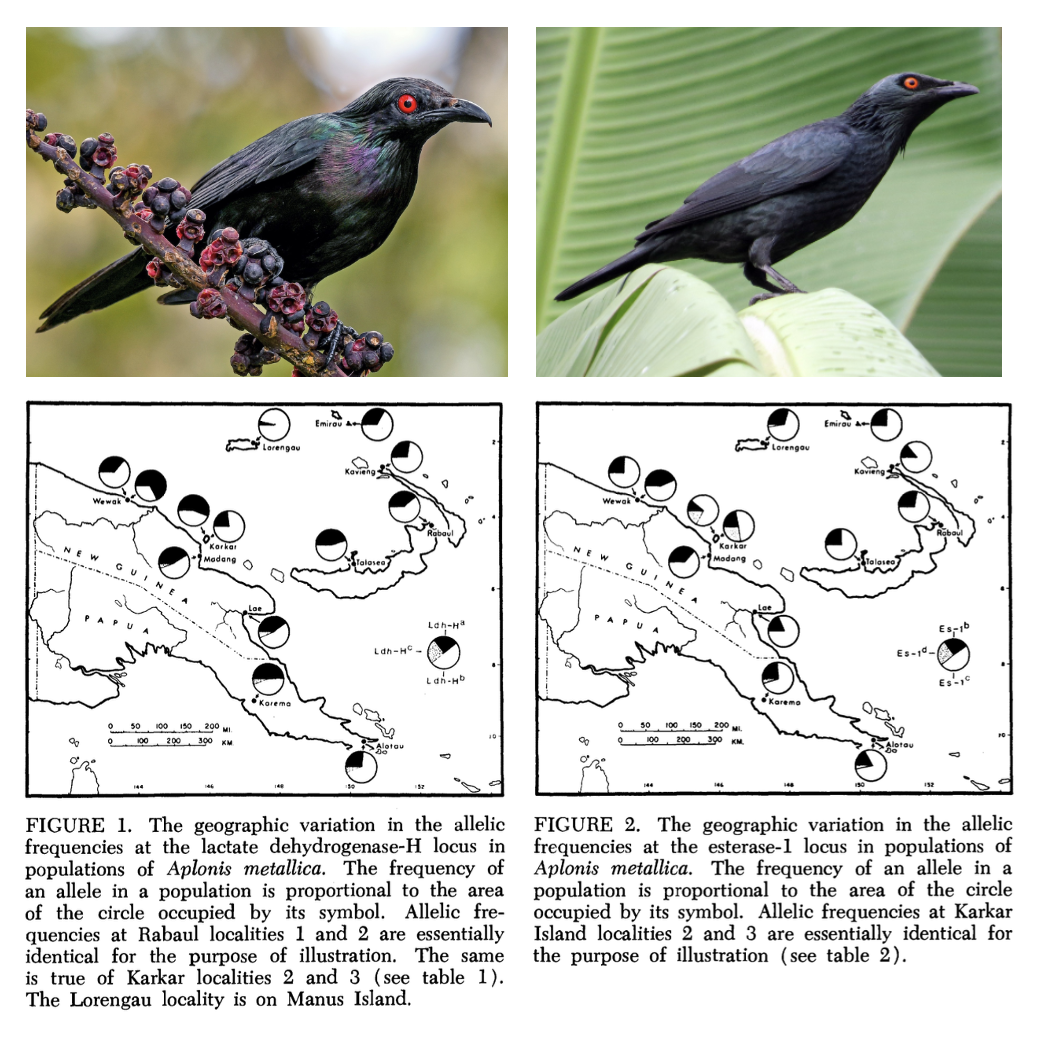 In an early application of protein electrophoresis to wild birds, Kendall Corbin, Charles Sibley, and Andrew Ferguson (Corbin et al. 1974) assessed the extent of protein polymorphism in two species of starling in the genus Aplonis. The species, found on New Guinea and its offshore colonies, differed in their basic biology: Metallic Starling Aplonis metallica nests in large colonies and is tolerant of human disturbance, while Singing Starling Aplonis cantoroides is a solitary rainforest dweller.