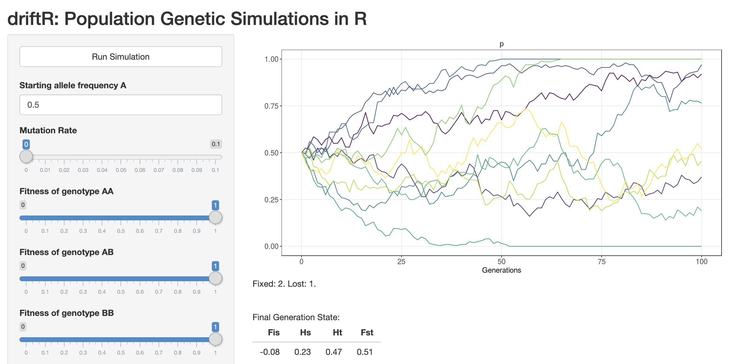 CJ Battey wrote an app to simulate allele frequency change due to drift and selection: https://phytools.shinyapps.io/selection/