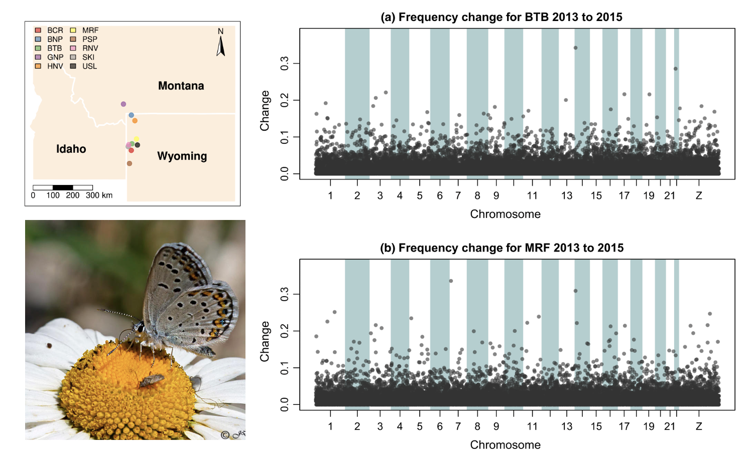 Drift constantly shapes allele frequencies in finite natural popualtions, but can be difficult to detect without temporal comparisons. Zach Gompert and colleagues (Gompert et al. (2021)) used population genomic time series data from from ten Lycaeides idas butterfly subpopulations in the Greater Yellowstone Ecosystem to test the hypothesis that gene flow over larger timescales maintained genetic diversity but did not impact generation to generation evolution. In doing so, they documented significant (\(\sim\)) changes in the frequencies of genetic variants across the gene—drift in action.