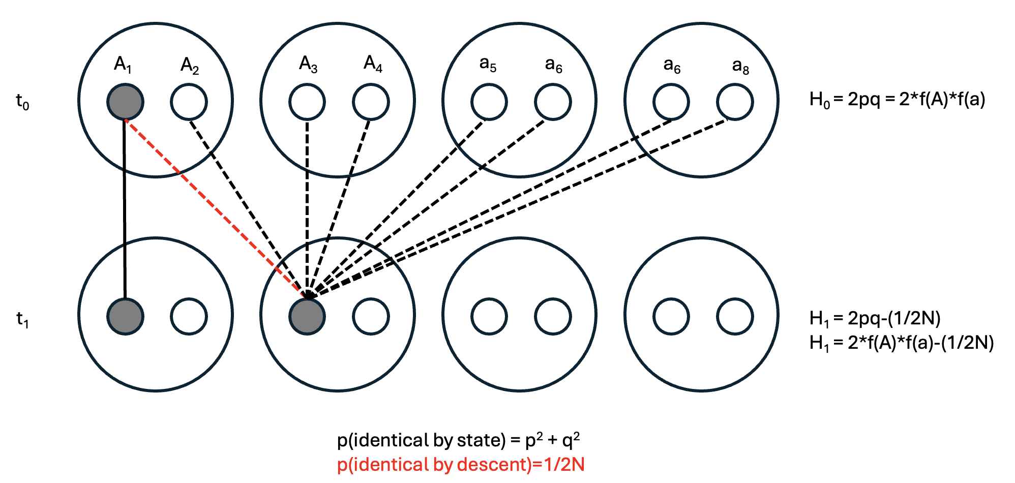A different way to arrive at this result using the building blocks of an area of population genetics known as coalescent theory, which we will discuss in greater length shortly. First, let’s (re)define familiar terms. In a single individual, homozygosity and heterozygosity in an refer to the state of having identical or different alleles at a given locus (respectively). In a randomly mating population, however, homozygosity refers to the probability two alleles drawn at random are identical (\(p^2 + q^2\)) or different (\(2pq\)). As indicated in the parentheses, these probabilities are given by terms from Hardy-Weinberg proportions.