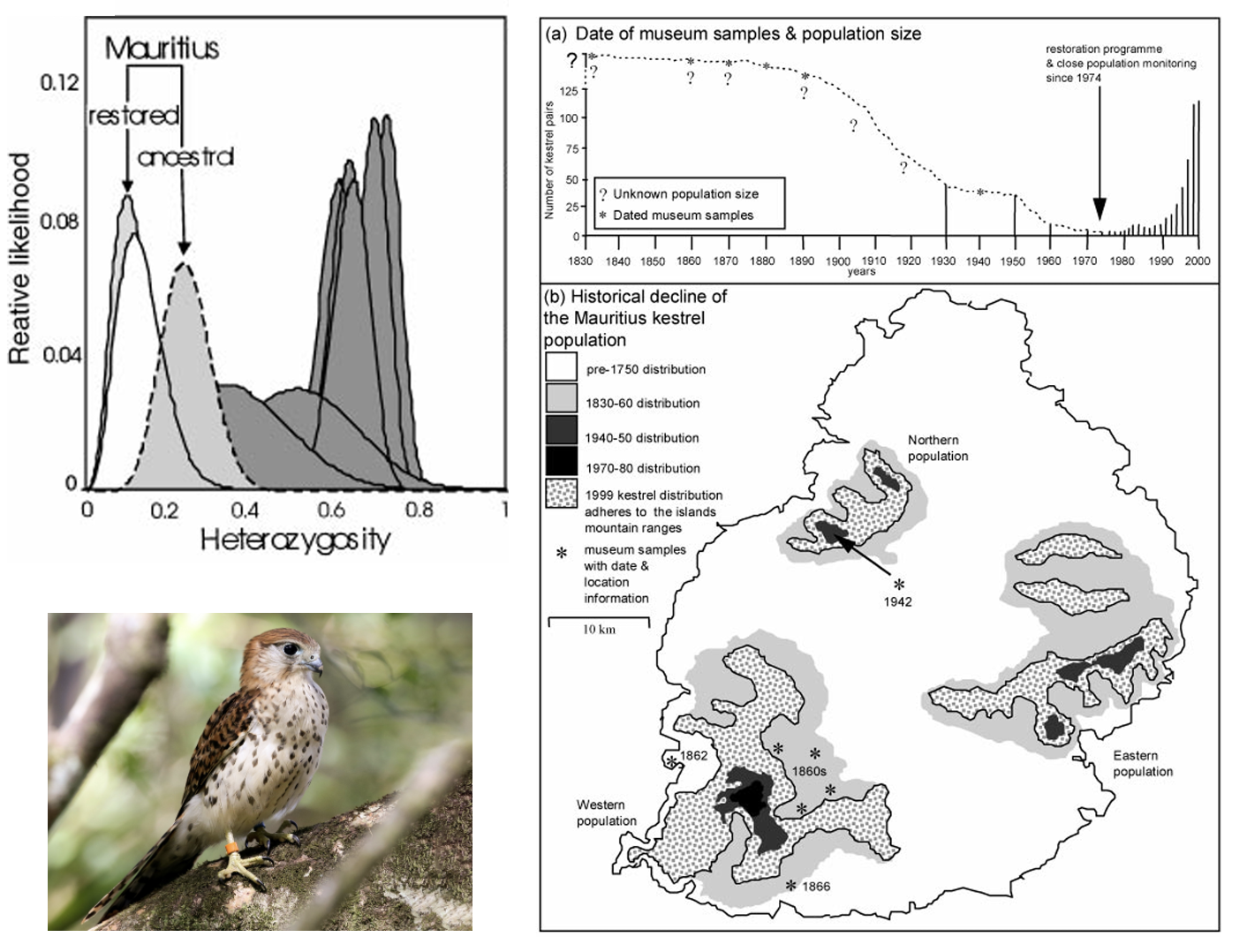 Mauritius Kestrel (Falco punctatus), the last surviving endemic raptor on the island of Mauritius, underwent a short-lived but severe population bottleneck due to forest loss and pesticide use, reaching a single known breeding pair in 1973. An intensive conservation breeding program halted and reversed the decline, leading to a current population of >400 individuals. Richard Nichols and colleagues (Nichols, Bruford, and Groombridge (2001)) used microsatellite data from contemporary tissue samples and historic museum specimens to describe changes in genetic diversity through time, showing that the restored population has significantly lower observed heterozygosity than either the ancestral (pre-bottleneck) population or mainland populations of other kestrel species.
