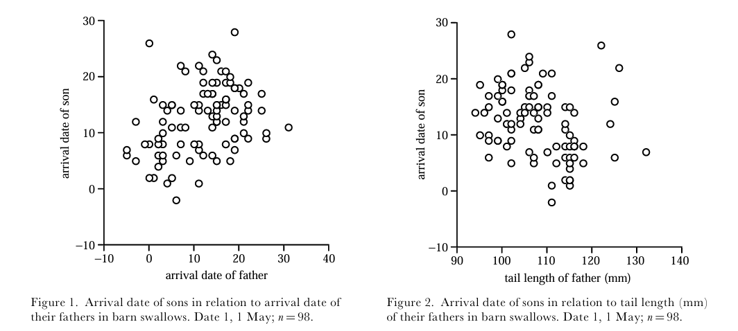 Barn Swallows (Hirundo rustica) are cosmopolitan songbirds that are migratory across the majority of their range. An important migratory phenotype is arrival date, which is (unsurprisingly) simply the date a given individual arrives on breeding grounds. Because this has impacts on resource and mating partner availability, it is potentially under strong natural selection. Because arrival date varies continuously, studying any genetic basis it might have requires tools from quantitative genetics. Anders Møller (Pape Moller (2001)) used field data on the arrival date of 98 father / son pairs of barn swallows to estimate heritability with the regression approach described above. This deceptively simple method revealed \(h^2=0.536\). This heritability was comparable to that of tail length, and indicates the trait may respond to selection.