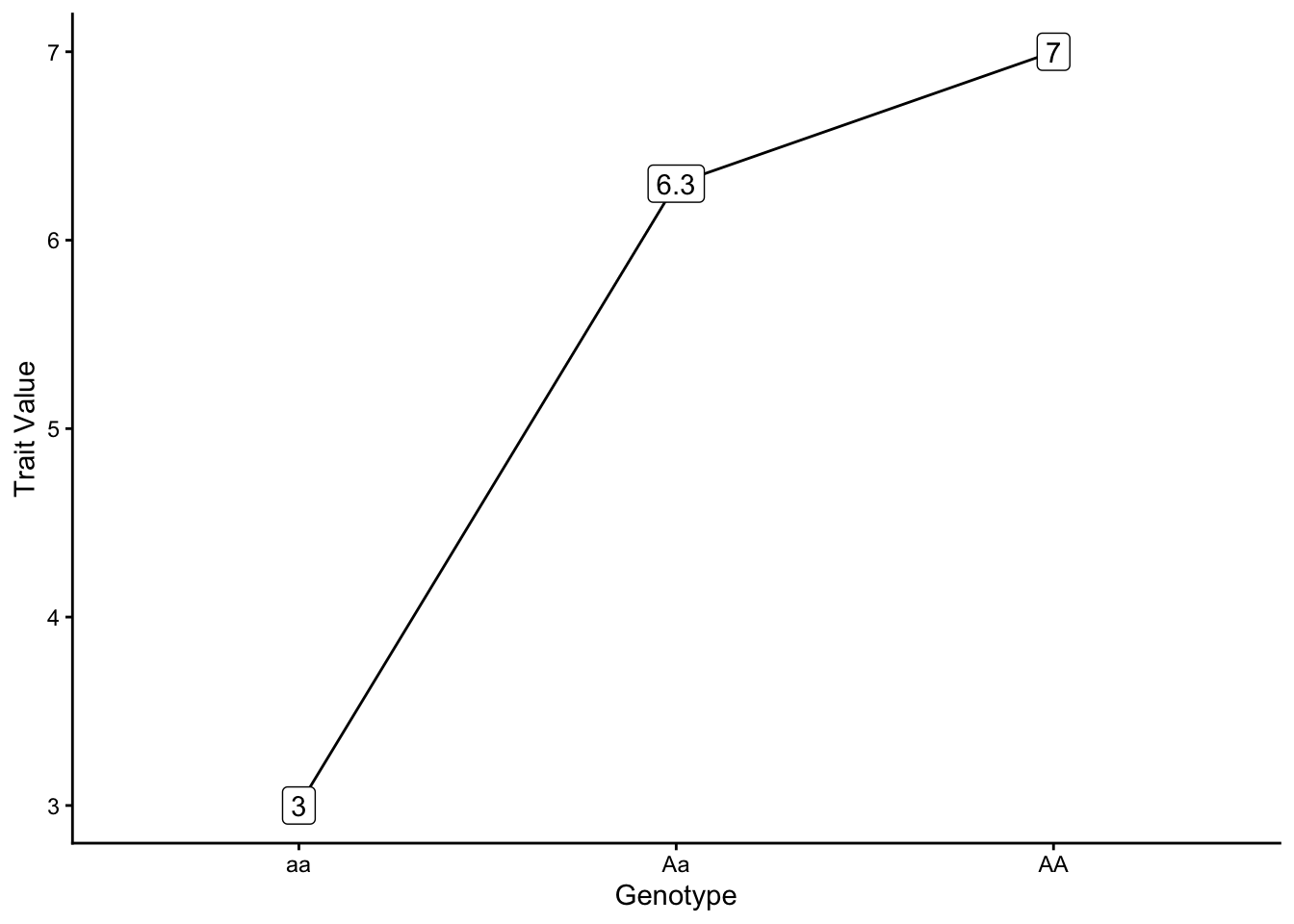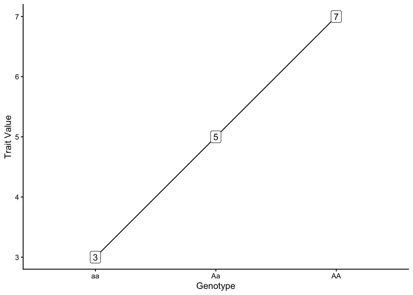 Different relationships between genotypes and genotypic values result from different modes of inheritance. In additive genetic variance, each allele contributes equally to the value of a phenotype, and the heterozygote’s trait values are the average of the two homozygotes (\(+a = 2; -a = 2; d = 0\)).